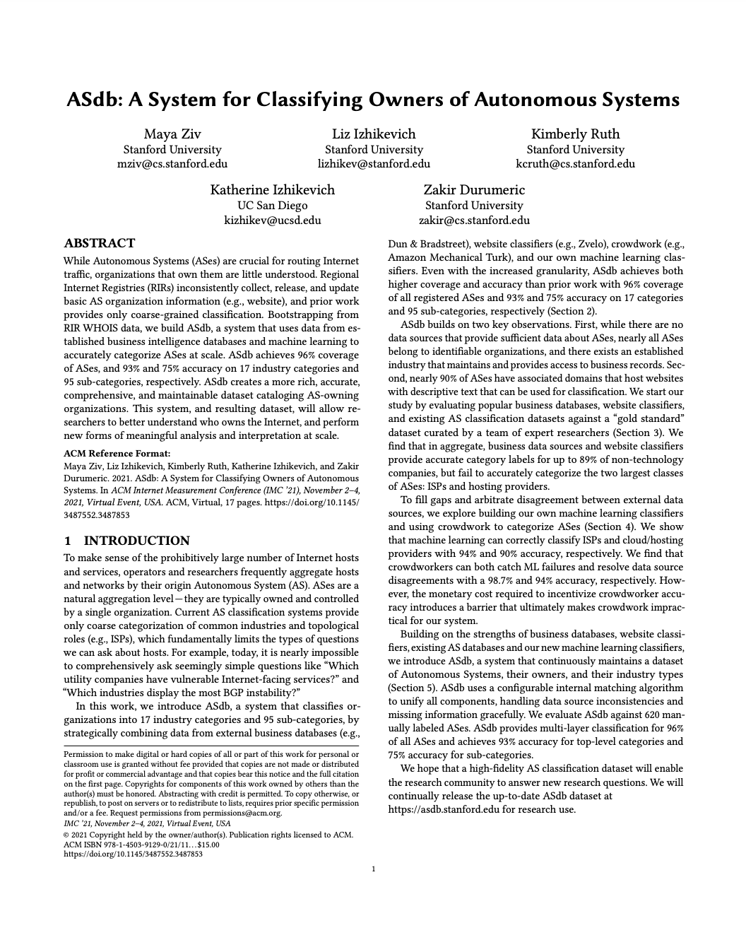 Abstract: While Autonomous Systems (ASes) are crucial for routing Internet traffic, organizations that own them are little understood. Regional Internet Registries (RIRs) inconsistently collect, release, and update basic AS organization information (e.g., website), and prior work provides only coarse-grained classification. Bootstrapping from RIR WHOIS data, we build ASdb, a system that uses data from established business intelligence databases and machine learning to accurately categorize ASes at scale. ASdb achieves 96% coverage of ASes, and 93% and 75% accuracy on 17 industry categories and 95 sub-categories, respectively. ASdb creates a more rich, accurate, comprehensive, and maintainable dataset cataloging AS-owning organizations. This system, and resulting dataset, will allow researchers to better understand who owns the Internet, and perform new forms of meaningful analysis and interpretation at scale.